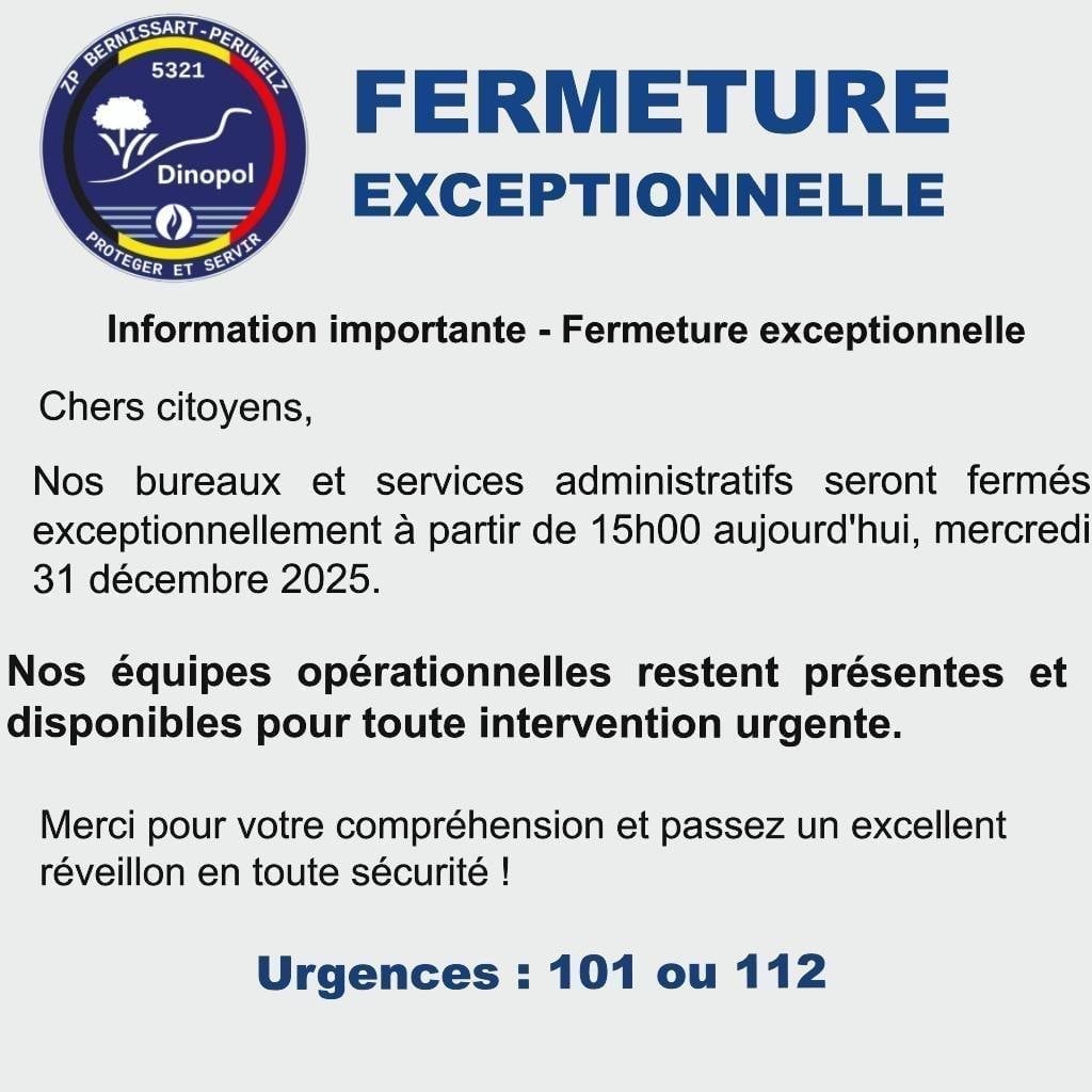 Conformément à l’article 25/4 de la loi du 07 décembre 1998 organisant un service de police intégré, structuré à deux niveaux, le Collège de police de la Zone de police Bernissart Péruwelz porte à la connaissance de la population que le Conseil de police se réunira le 05 janvier 2026 à 18h30 à la salle communale de Roucourt situé à 7601 Roucourt, rue Julien Bouchain, 3 (anciennement la Justice de Paix). L’ordre du jour de cette séance est fixé comme suit: