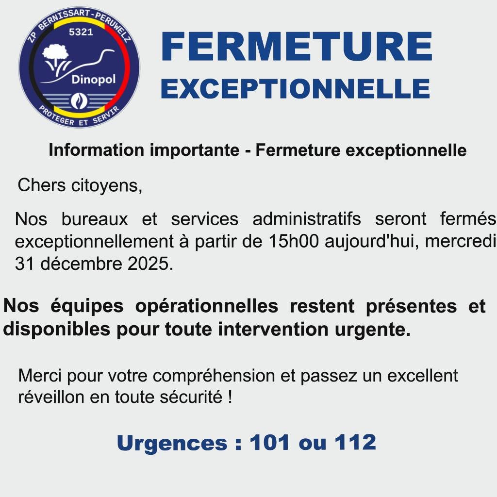 Conformément à l’article 25/4 de la loi du 07 décembre 1998 organisant un service de police intégré, structuré à deux niveaux, le Collège de police de la Zone de police Bernissart Péruwelz porte à la connaissance de la population que le Conseil de police se réunira le 05 janvier 2026 à 18h30 à la salle communale de Roucourt situé à 7601 Roucourt, rue Julien Bouchain, 3 (anciennement la Justice de Paix). L’ordre du jour de cette séance est fixé comme suit: